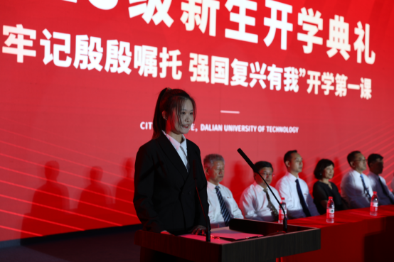 新生代表、外国语学院英语专业2023级陈妍驰在发言时信心满满:四年后当我们离开这片热土的时候,回眸这段难忘的岁月,我们能充满自信的说:青春,无悔!