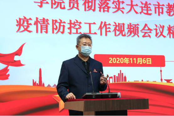 本网讯(文/图:林雪)11月6日,党委书记郭玉铸在图书馆一楼报告厅主持召开了贯彻落实大连市教育系统疫情防控工作视频会议精神专题会。