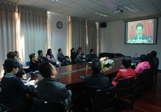 部分无课教工聚集在1306教室和9楼会议室,集中收看中国共产党第十八次全国代表大会开幕会盛况,聆听胡锦涛总书记所作的大会报告。