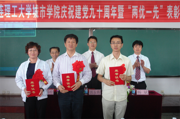在1308教室隆重举行庆祝建党九十周年暨“两优一先”表彰大会。学院领导匡国柱、郭玉铸、杨斌、张明君、沈海龙出席大会,全院教工党员和部分学生党员参加了会议。会议由副院长兼党委副书记杨斌主持。