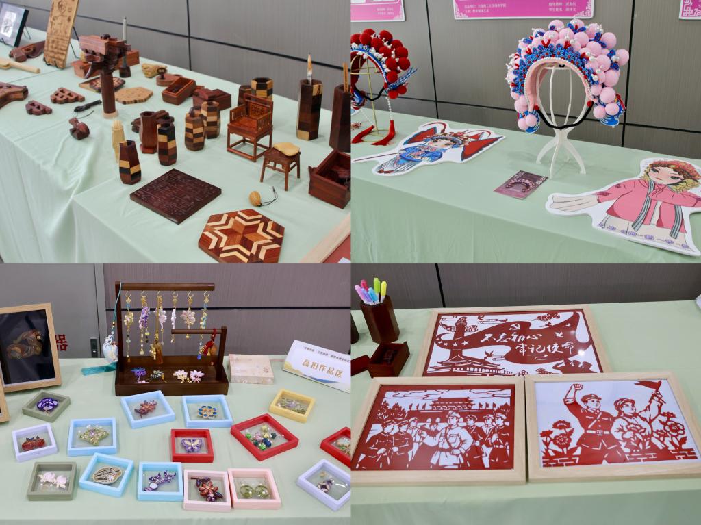 师生结合现代设计理念创作的非遗文创作品。精美的木雕作品纹理清晰、栩栩如生;细腻的刺绣针脚工整、纹样雅致;古朴的陶瓷器具釉色莹润、造型独特,引得现场师生驻足观赏、拍照留念。