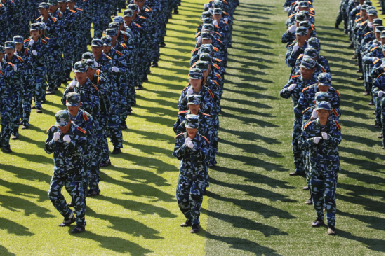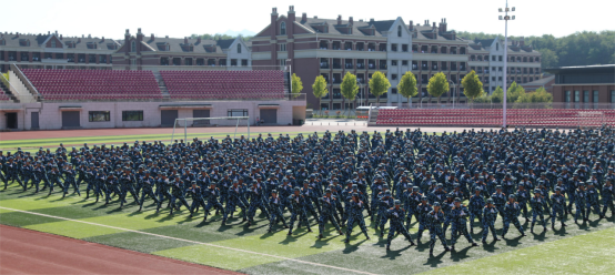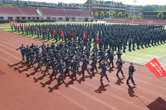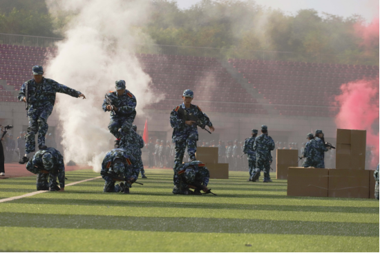 分列式检阅完毕后,由1800余名新生进行了军体拳表演,其雄壮的气势和铿锵有力的动作赢得了与会领导和现场观众的阵阵掌声与喝彩。