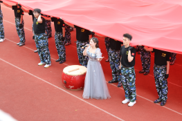 电子与自动化学院方阵由78名同学组成。入场时两名红装同学牵动两条长龙彩带奔跑,寓意电动学子将以飞龙之势扬帆启航,筑梦辉煌;一面8X12米的国旗由后向前将64名仪仗队员盖住,《万疆》歌起,一名女生缓缓走到方队前,深情演唱。
