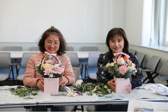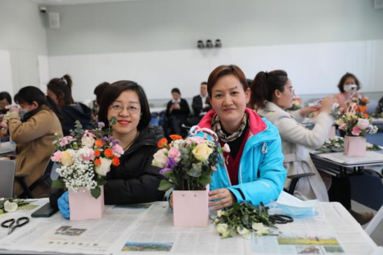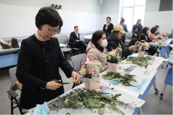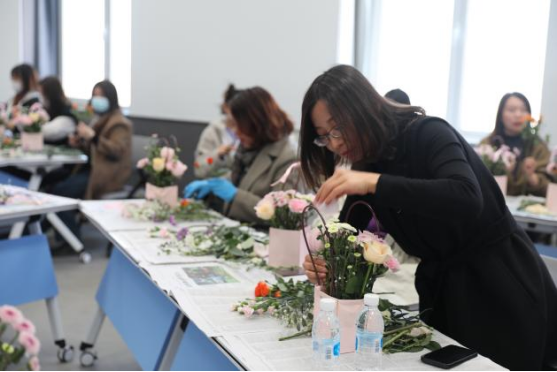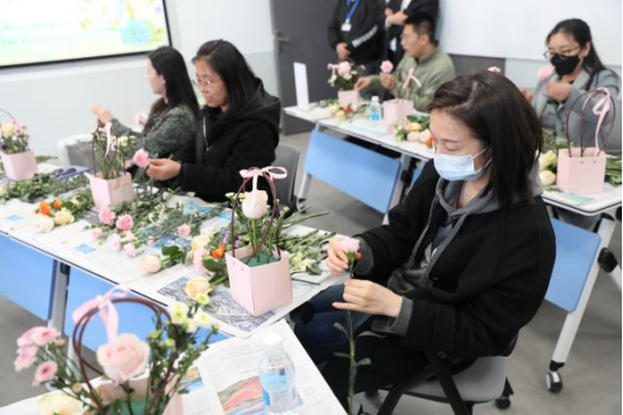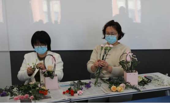 参加活动的教师们聚精会神、兴趣盎然。通过结合花朵大小、颜色搭配、高低相间及主次衬托,教师们设计并创造出一件件专属的各具特色的花艺作品。