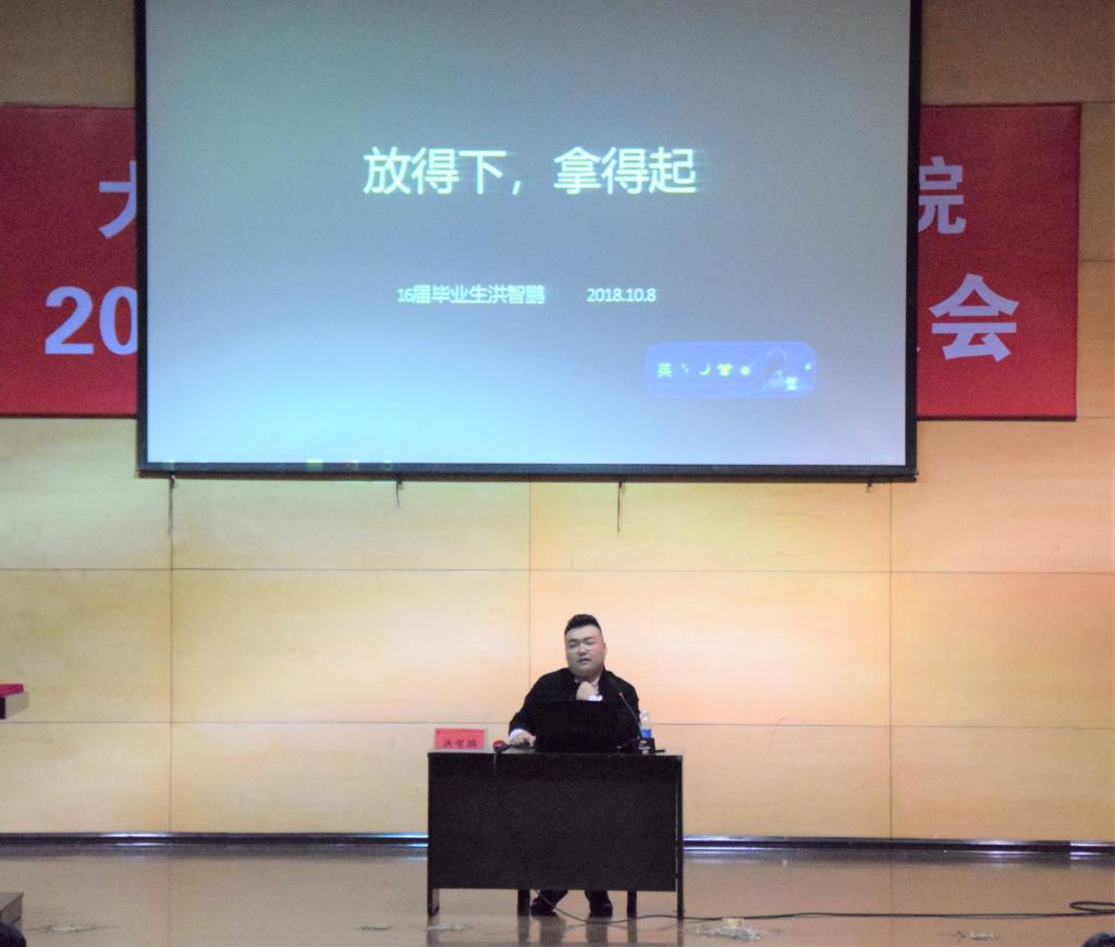 本网讯 10月8日中午,一场题为《放得下,拿得起》的就业与创业指导讲座在图书馆报告厅举行。外国语学院特邀本院2016届毕业生、杭州屹潮网络科技有限公司创始人洪智鹏担任主讲嘉宾,讲座由外国语学生工作办公室主任赵宁主持。外国语学院副院长宁强、辅导老师张盛秋、杨蕊以及大二、大三400余名学生到场聆听了讲座。