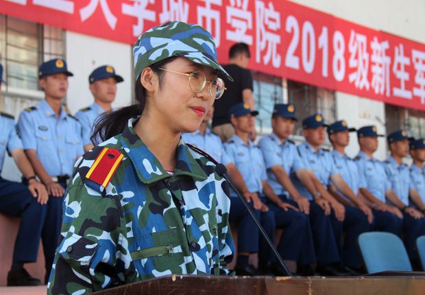 外国语学院2018级日语2班陈欣媛同学代表新生发言,她对十天来承担和保证训练任务的教官们道出由衷的感谢,表示将在今后的学习生活中坚持和发扬军训精神。
