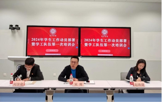 本网讯 3月18日,2024年学生工作动员部署暨学工队伍第一次培训会在管理楼308智慧教室召开。培训会由学院党委委员、副院长宋辉主讲,“一站式”学生社区党总支书记兼学生工作部主任刘学奇主持会议。