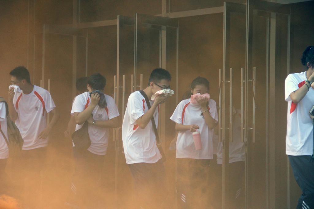 随后,全场工作人员准备就绪,工作人员拉开烟雾弹装置,启动体育馆内消防主机上的警报,通过消防广播发出逃生指令,逃生疏散演习正式开始。同学们按照演习计划,用毛巾掩住口鼻、弯腰、低姿,迅速有序地从体育馆内转移到室外空旷场地。