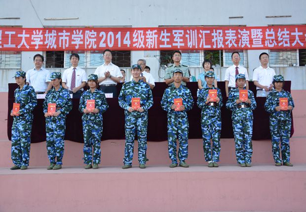 关于2014级新生军训表彰的决定》,受表彰的24个先进集体和63名先进个人上台接受了学院领导和部队首长的嘉奖。
