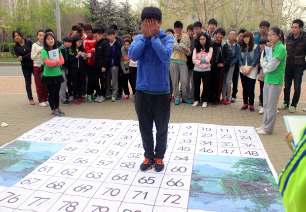 参加“穿越雷阵”拓展训练活动的同学如履薄冰