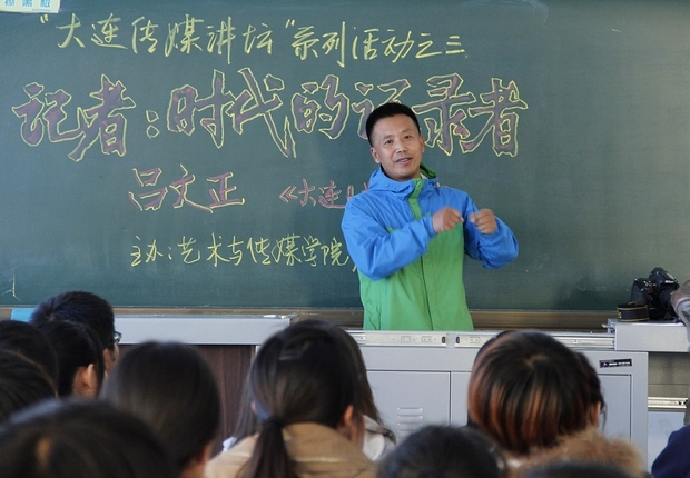 吕文正现为《大连日报》摄影部主任记者,曾参加过多项大型采访活动,作品多次荣获中国新闻奖、辽宁省新闻奖,曾被评为“辽宁省十佳记者”、“辽宁省十佳摄影记者”、“新华社十佳摄影师”、北京奥运会火炬手等。由于是军人出身,他一上讲台,先是一个标准的军礼,随即脸上挂满笑容,通过自己不同时期拍摄的新闻照片,把一个个他所经历的故事讲述给学生。