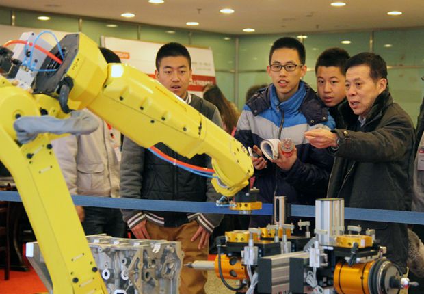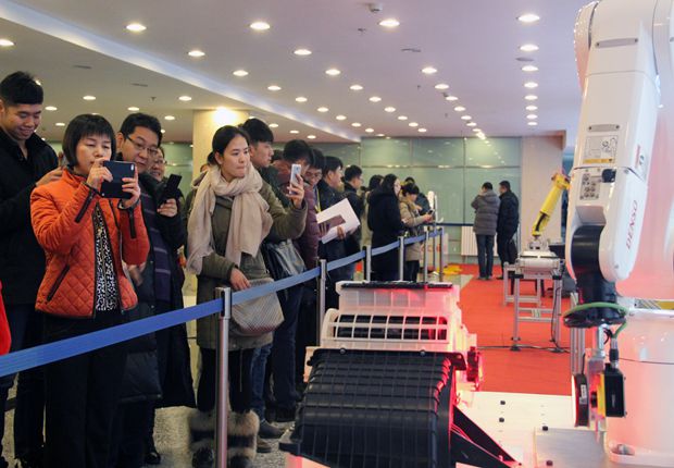 师生也纷纷抓住这一难得的机会,与业内人士沟通,了解机器人性能,体验自动化、人工智能给当今人们工作、生活带来的变化。在上海发那科机器人有限公司生产的一款具有码垛、搬运、喷涂、焊接等功能的机器人展台前,一位小伙子看得仔细,问得专业。他说自己是电子与自动化学院的一位在校生,从小就是一个机器人迷,以前由于条件所限,没有机会接触机器人,只是在一些影视作品和科技资料上看到过机器人。如今近距离接触机器人,亲眼看到机器人的高超技能和精彩表演,真是令人眼界大开。他说,零距离感知机器人,总有一种紧迫感和莫名的压力,依稀听到机器人的脚步声正日渐清晰,感到机器人时代确实已经离我们不远。他说他要像本次展示会的主题词“把握今日,智成未来”那样,未雨绸缪,做一个有准备的人。