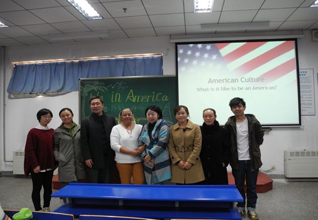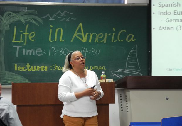 美籍教师Sharon Shipman在教学楼1201室作题为“Life in America”的讲座,外国语学院师生80多人聆听了讲座。
