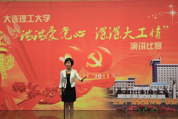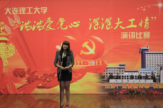 教师代表李琢围绕“风云九十载,嘹亮中华音”,用诗一样的语言,描绘了中国共产党九十年风云变幻的历史画卷,赞颂了中国共产党拯救旧中国,发展建设新中国的历史功绩,表达了人民教师爱党、爱国、爱教育,为飘扬的党旗争光添彩的心声。学生代表王莲同学以平和的语言和缜密的思维深深表达:“党的思想给了青年人很多精神财富,党史让我们学会感恩,对党的感恩之情,对大工的感恩之情,激励我们塑造更有价值的自己,报答党对我们寄予的厚望,做一个优秀的党员。”王莲同学的演讲受到大连市朗诵学会秘书长的首肯。