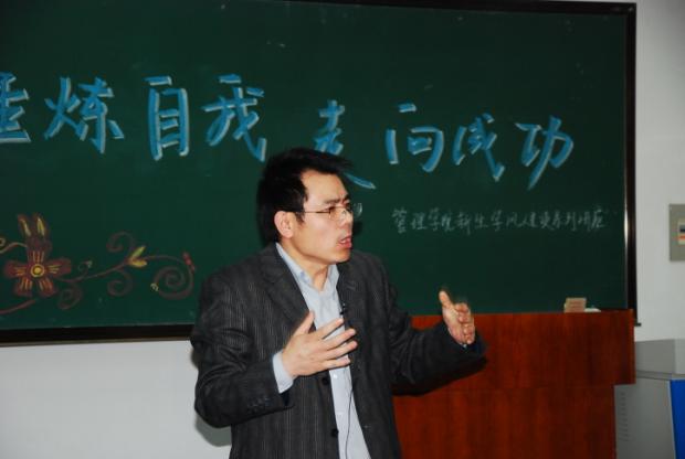 优良学风建设是管理学院学生教育工作的重点,为了进一步促进优良学风建设,管理学院邀请公共事业管理专业教研室教师郭荣庆为2010级新生进行励志教育。郭荣庆老师毕业于中国社会科学院研究生院,从默默无闻的农民工到万人瞩目的中国社会科学院研究生,郭老师靠着自己的勤奋和刻苦,百折不挠,自学成才,创造了求知道路上的一个奇迹,完成了人生旅途上的一次蜕变。