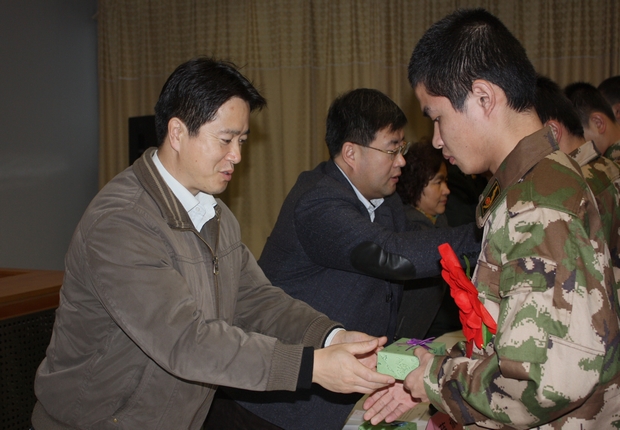 (学校和学院领导向入伍新兵赠送纪念品)