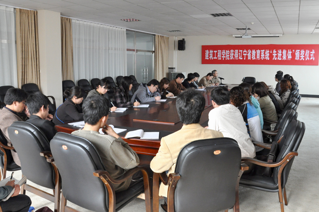 在8楼会议室举行建筑工程学院获得辽宁省教育系统“先进集体”颁奖仪式,匡国柱院长向建筑工程学院颁发辽宁省教育系统“先进集体”荣誉牌匾,他勉励建筑工程学院全体教工与69堂