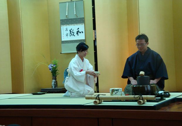 由日本国驻沈阳总领事馆大连办事处和大连中日友好人才培训中心联合举办的“日本文化介绍展”交流活动9月19日下午在大连中日人才培训中心举行。本次活动邀请茶道世家“里千家”和被称为插花界最古老流派的“池坊流”现场表演,69堂