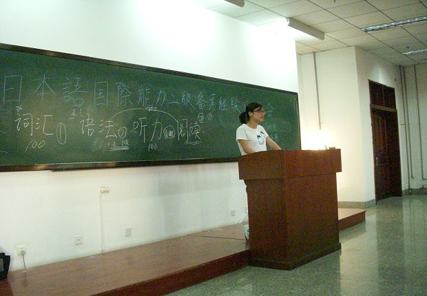 三位同学首先分析了近几年过级考试的总体形势,并结合自己的经验,从文字和词汇、听力、阅读和语法三方面详细介绍了复习方法、答题技巧。三位同学还分别就如何选择备考资料、如何安排日常上课与复习时间、如何备考难度最大的听力部分等具体问题与在场的同学进行了交流。