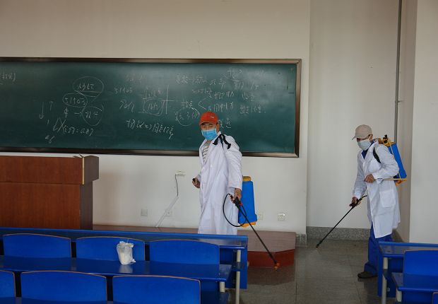 (图为保洁人员正在对教室进行消毒)