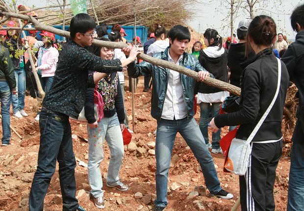 在现场专业人员的指导下,全体党员和入党积极分子两、三人一组,分工协作,密切配合,严格按照“三埋两踩一提苗”的技术规程,扶苗、填土、提苗、踩实,对每一个环节都做到一丝不苟,严细认真。经过一上午的努力,共植树30多棵,用自己的双手为未来造福,为子孙后代造福。