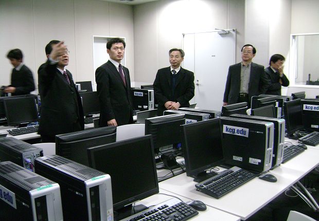 1月18日上午,访问团一行来到京都信息大学京都站前校区,参观了计算机实验设备陈列展、教室、实验室、多媒体远程教育网络实验室等,听取了大学院的介绍,宾主双方就合作教育的许多细节进行了卓有成效的商讨,签署了合作教育框架协议,为69堂