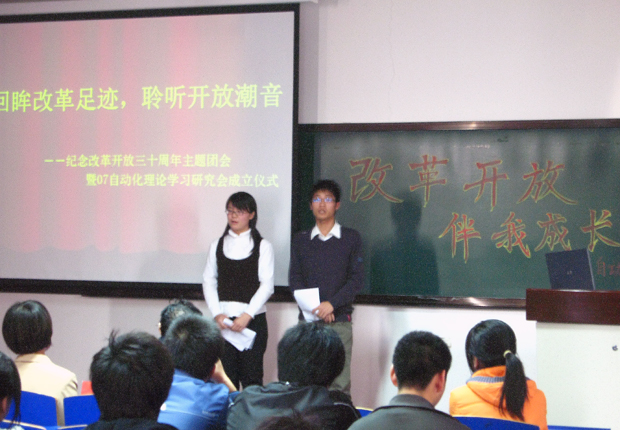 11月7日下午,自动化07级全体同学在教学楼1210教室隆重举行“改革开放伴我成长”主题团会暨自动化系理论学习研究会成立仪式。学院党群工作部主任刁庭元和自动化系主任张明君应邀出席了本次会议。