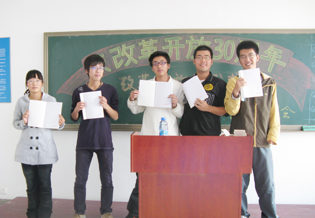 团会由团支部书记云璐主持,首先各小组以自己独特的方式展示了改革开放以来伟大祖国所取得的各项成就,有的以大事纪的形式展示改革开放后的成果,有的以演讲、歌唱、诗歌朗诵等形式诠释自己对改革开放30年来我国发生显著变化的理解与感受,王凯同学的自创歌曲《改革开放》将团会推向了高潮。