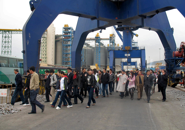 为庆祝改革开放三十周年,亲身体验和了解改革开放给大连经济技术开发区带来的巨大变化,10月29日下午,学院党委组织全院无课教工党员参观了开发区北良港及大窑湾粮食码头。