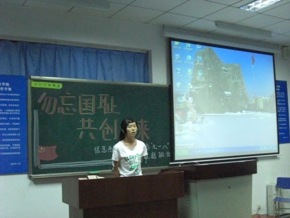 为纪念“九•一八事变”77周年,9月18日晚,信息系0702班在1201教室召开“勿忘国耻,共创未来”主题班会,重温国难历史,表述爱国情怀。