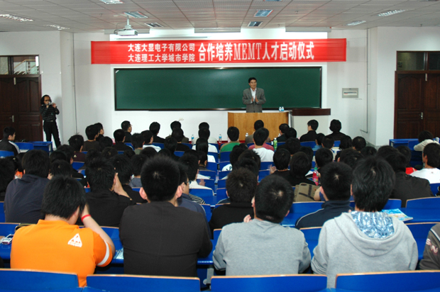在教学楼1212教室隆重举行“合作培养现代电子制造技术(MEMT)工程人才启动仪式”。大连大显电子有限公司总经理石家友、院长唐志宏等合作双方领导出席了大会,电子系200多名师生参加了会议,会议由院长助理马建军主持。