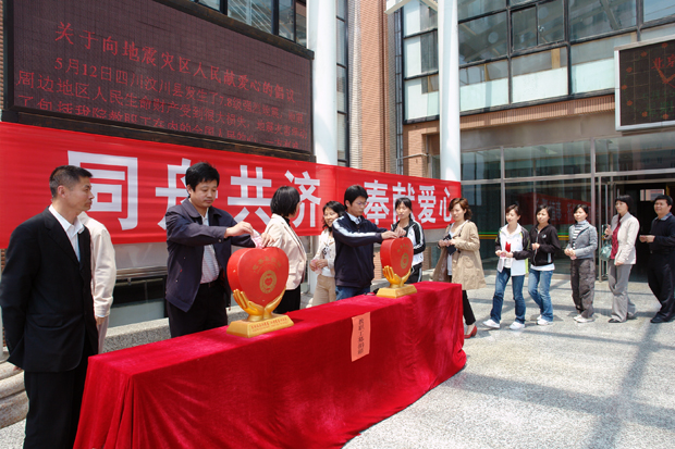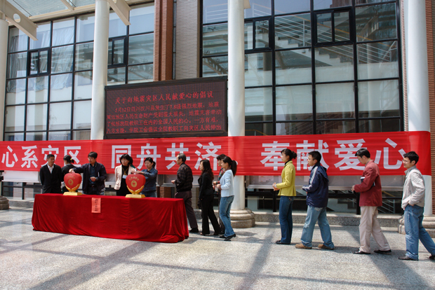 的食堂、卫生所、超市、浴池、保洁等部门的员工也伸出援手,仅三个学生食堂就捐款7378元;部分外教也到募捐点捐献,表达了国际友人对我国抗震救灾工作的支持。