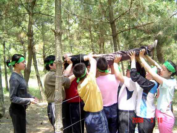 “盲人方阵”项目要求团队的每个人在带上眼罩的情况下,找到教练提供的一根长绳子和三根短绳子,然后利用这四根绳子组成最大的正方形。这个团队迅速找到绳子后,在充分利用现有绳子的条件下,创造性地运用了人的手臂,使方阵最大化。最后,连教官都不由得啧啧惊叹:你们这个团队是做得最好的团队。