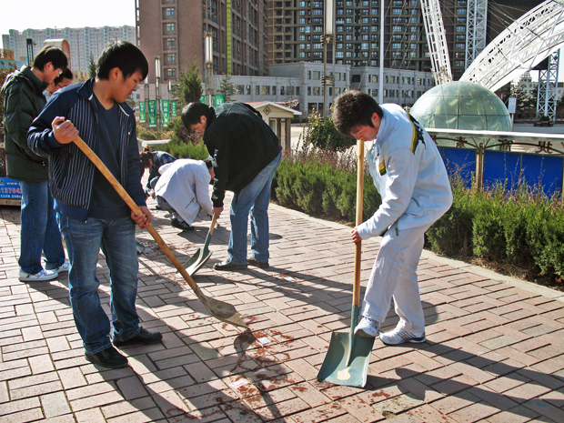 上午9时,参加环保活动的义工自备清扫工具,在开发区五彩城社区门前集合,随后,对五彩城内的建筑物墙壁污渍及各处张贴的野广告进行了清理。义工们还向过往行人发放传单,宣传环保知识,并对人们的咨询做了耐心的讲解。