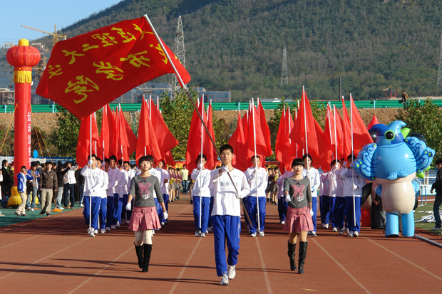 上午8时,伴随着激昂的运动员进行曲,大会开幕式准时开始,偌大的运动场顿时变成了欢乐的海洋。在院旗的引领下,红旗队、花束队及各院系的12支代表队与教工代表队迈着矫健的步伐依次进入会场,接受学院领导和全体师生的检阅。他们或高举一面面火红的旗帜,或挥舞手中五彩缤纷的鲜花,或摆成富有象征意义的奥运五环标志等图案,或手擎一条条标语拼版,精神抖擞、意气风发。教师队伍放飞手中的气球,自信的笑容更是体现了“谁与争锋”的精神风貌。