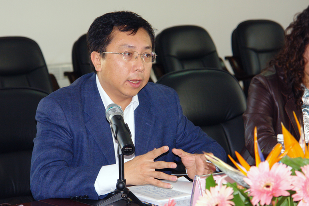 在学院组织的汇报会上,杨斌副院长主持会议,唐志宏院长致欢迎辞。