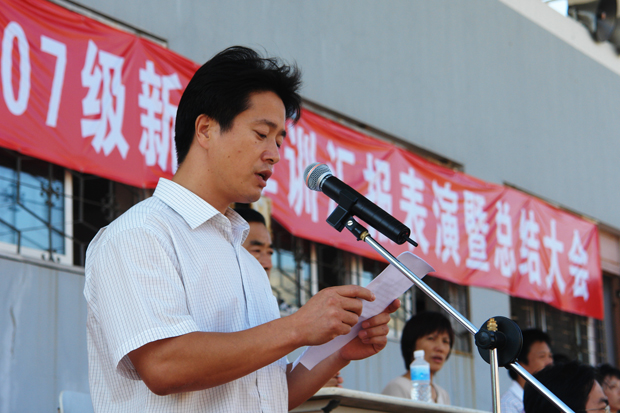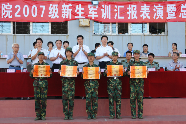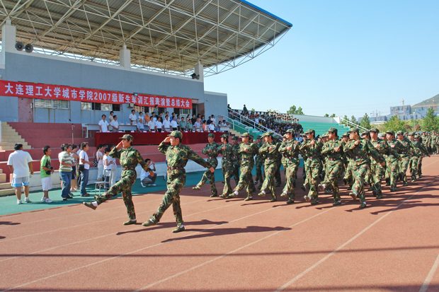 当天下午14:00,2007级新生军训会操表演暨总结表彰大会在体育场隆重举行。院长唐志宏、院党委书记郭玉铸、沈阳军区大连综合训练基地军训办主任于江上校、政委杨全城中校、副院长徐偱、杨斌、学生指导部李宪起主任以及各院、系负责人参加了大会。会议由学院团委书记孙云海主持。