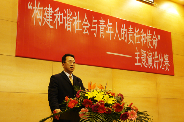 10位选手演讲结束后,学院党委书记郭玉铸同志做了讲话,他首先感谢选手们精彩的演讲。他指出:“学院党委开展的‘构建和谐社会与青年人的责任和使命’系列活动的目的和意义,就是为了加强大学生的思想政治教育,以社会主义核心价值体系来构建校园文化。一个多月来,从班级、到级队、到分院,一直到总决赛,广大同学通过演讲、讨论、征文等活动,每一位参与主题教育活动的同学,都进行了深刻地思索,认识上有了不同程度的提升。刚才各位选手的演讲,在主体的把握上都非常好,体现了学院开展的这一项活动的丰硕成果。当今时代每个人都对青年人的责任与使命有不同的认识和答案,但我认为不外乎有这三项:一、为民族的振兴与国家的发展而勇于承担重任。二、为社会进步与经济发展建功立业。三、为孝敬自己的父母,实现人生价值而不懈奋斗。本次演讲比赛是大讨论活动的重要环节,学院党委要把本次主题教育活动优秀稿件集结成册,书名为《把壮丽的青春献给新时代》,来进一步推动活动的深入开展。每个人的生命都只有一次,我们都要在历史的长河中定位人生,要在人生的奋斗中来创造历史,记录下我们青春的印记。”
