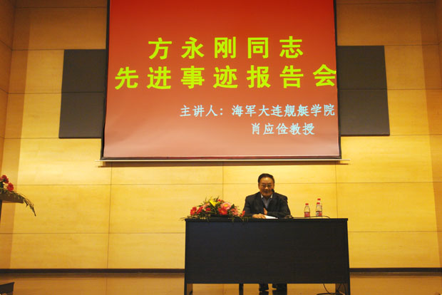 在图书馆报告厅隆重举行“方永刚先进报告会”,邀请海军大连舰艇学院教授肖应俭讲授他眼睛里的方永刚教授。报告会由副院长杨斌主持,院党委书记郭玉铸,副院长王铁成出席了报告会,各部门负责人,部分老师及学生聆听了报告。