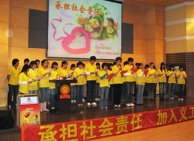 启动仪式临近尾声,新闻与公共管理系同学自觉发起募捐活动,为开发区都悦里社区身患尿毒症的孤寡老人筹集善款1200元。最后义工征集活动在新闻与公共管理系同学演唱的一曲《让世界充满爱》的歌声中圆满结束,仅在当天,就有265名师生报名加入义工队伍。