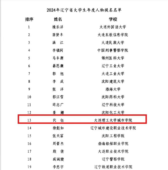 外国语学院2022级学生代钰荣获2024年“辽宁省大学生年度人物”提名奖。