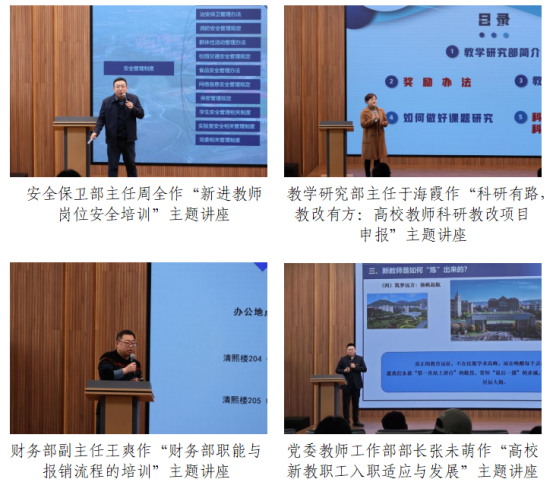 3月8日,第二期培训以校史教育开篇,邀请9位职能部门负责人为新进教职工解读各部门的职能、制度以及工作流程,帮助新教师全景式了解学院治理体系,以更好地开展教育教学工作。