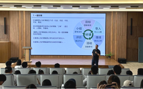 马瑞新指出,一堂好课包含六要素,即目标、导入、情境、活动、评价及小结,结合自身教学创新经验,从课程简介、课程创新、课程特色等方面分享如何说课,在课标、教材、学情、教法、训练及程序方面进行详细阐述。