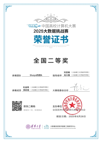 由杜金雨、李昕明同学组成,刘亚楠、肖大薇老师指导的“Shuiys”团队,在线上比赛中沉着应战、发挥稳定。A阶段中,团队不断优化模型与特征工程,初战告捷;B阶段通宵攻坚,确定以BiLSTM + Attention为核心模型,成绩持续提升;至关键的C阶段,与清华大学等顶尖学府的本科生、研究生、博士生同场竞技,经过多轮严格评审,最终以全国第14名的成绩获二等奖。