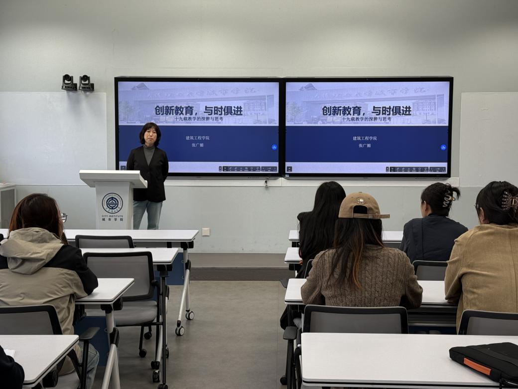张广媚以“创新教育,与时俱进”为题,围绕“创新”主线,从教学理念、课程概述、提升课堂创新性实践育人、校外通过企业研习4个方面深入讲解。