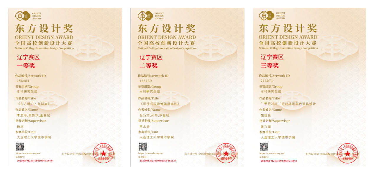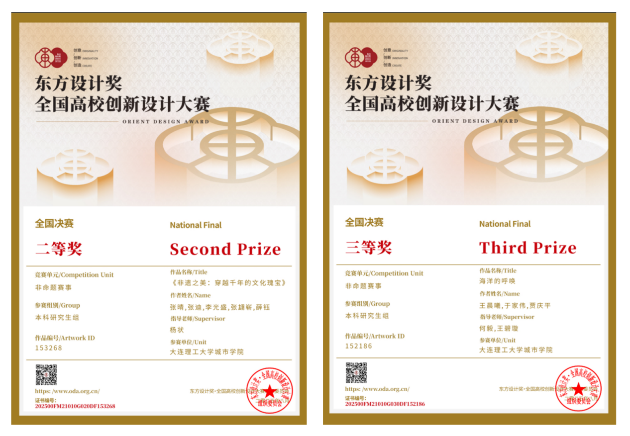 由杨状教师指导,学生张晴、张迪、李光盛、张翃崭、薛钰的作品《非遗之美:穿越千年的文化瑰宝》荣获全国决赛二等奖;由何毅、王碧璇教师指导,学生王晨曦、于家伟、贾庆平的作品《海洋的呼唤》荣获全国决赛三等奖。