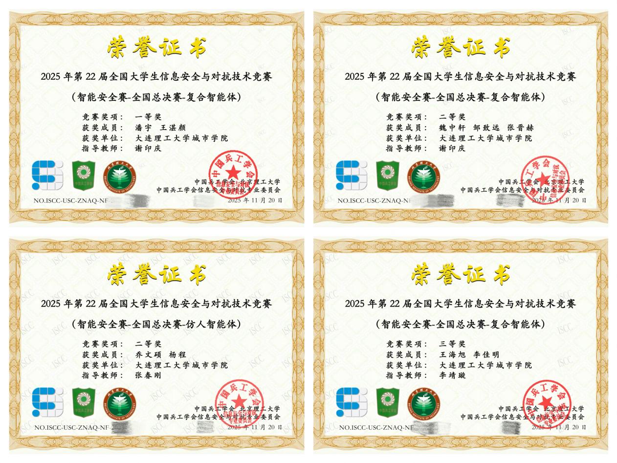 选派的四支参赛队伍,激烈竞争中表现卓越,夺得智能安全赛道国家级一等奖1项、二等奖2项、三等奖1项,创下69堂