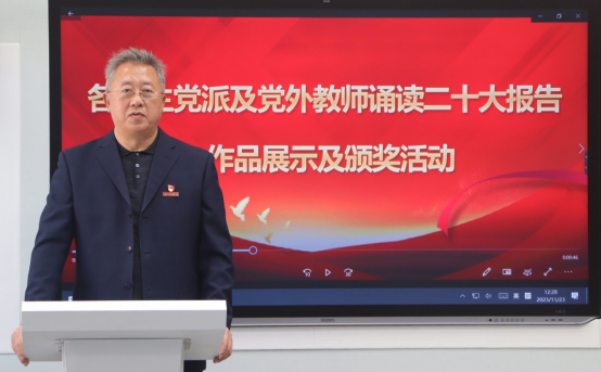 活动结束后,郭玉铸书记发表讲话。他指出,在各民主党派和党外教师中间开展诵读党的二十大报告作品征集活动是学院党委加强对各民主党派和党外教师的教育引领,加强统一战线工作的一项重要内容,也是推动学习宣传贯彻党的二十大精神走深、走实的一项举措。