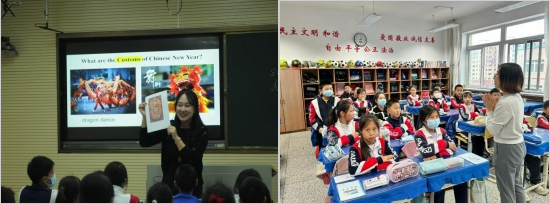 王洋老师和胡竞老师运用多媒体课件,从相关英语词汇开始,声情并茂地用英语介绍中国春节的由来,带领孩子们用英文讲述各地的春节习俗,弘扬中华优秀传统文化。