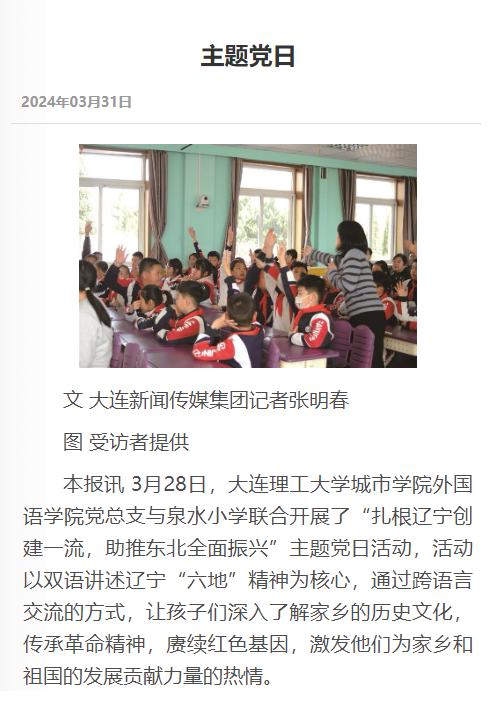 外国语学院党总支与泉水小学于2023年3月达成共建以来,共开展主题活动5次,实现了互学互促、共同进步的目标,本次活动更让辽宁红色“六地”精神在孩子们心中生根发芽,为他们注入了为家乡振兴而努力的信念和动力。大连晚报关注了本次活动,并进行报道。